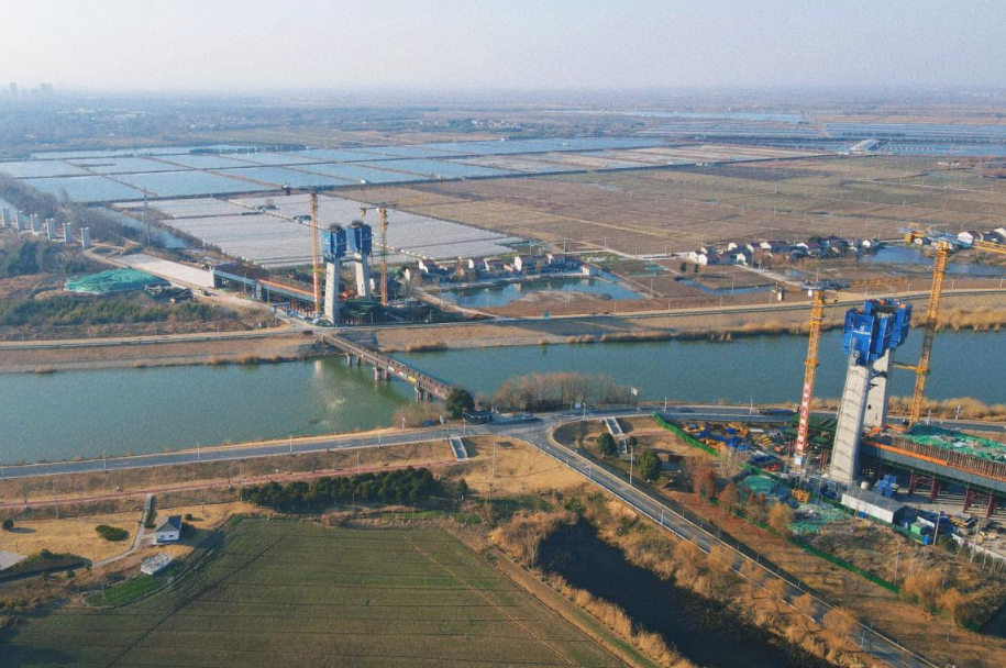 ▲1月18日,南京枢纽项目二分部跨滁河斜拉桥主塔中塔柱、跨蒿子圩168m连续梁拱主墩顺利完成浇筑。